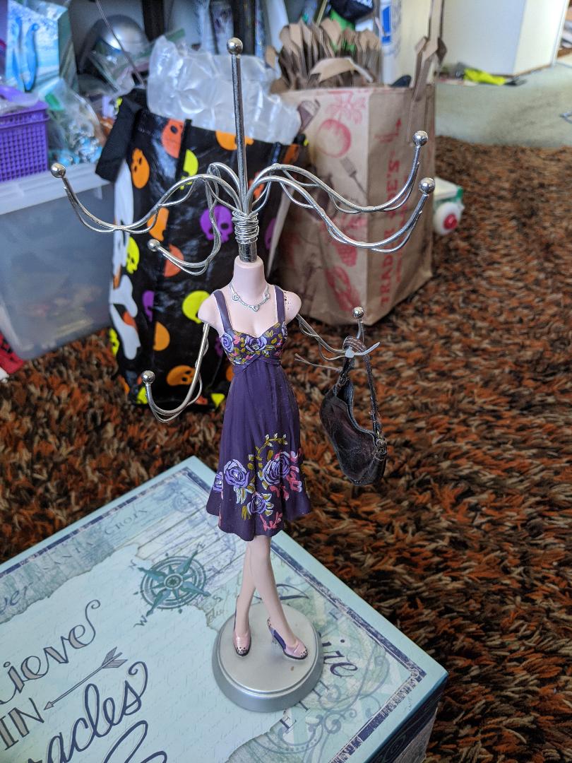 The jewelry holders has mini beautiful purple flower dress on her body part.