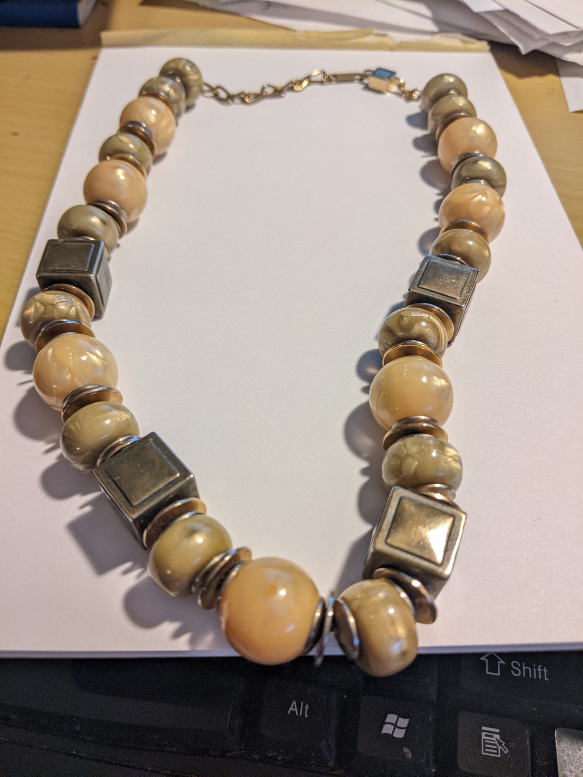 There are square beads of fake chrome and olive and beige beads all of the necklace.