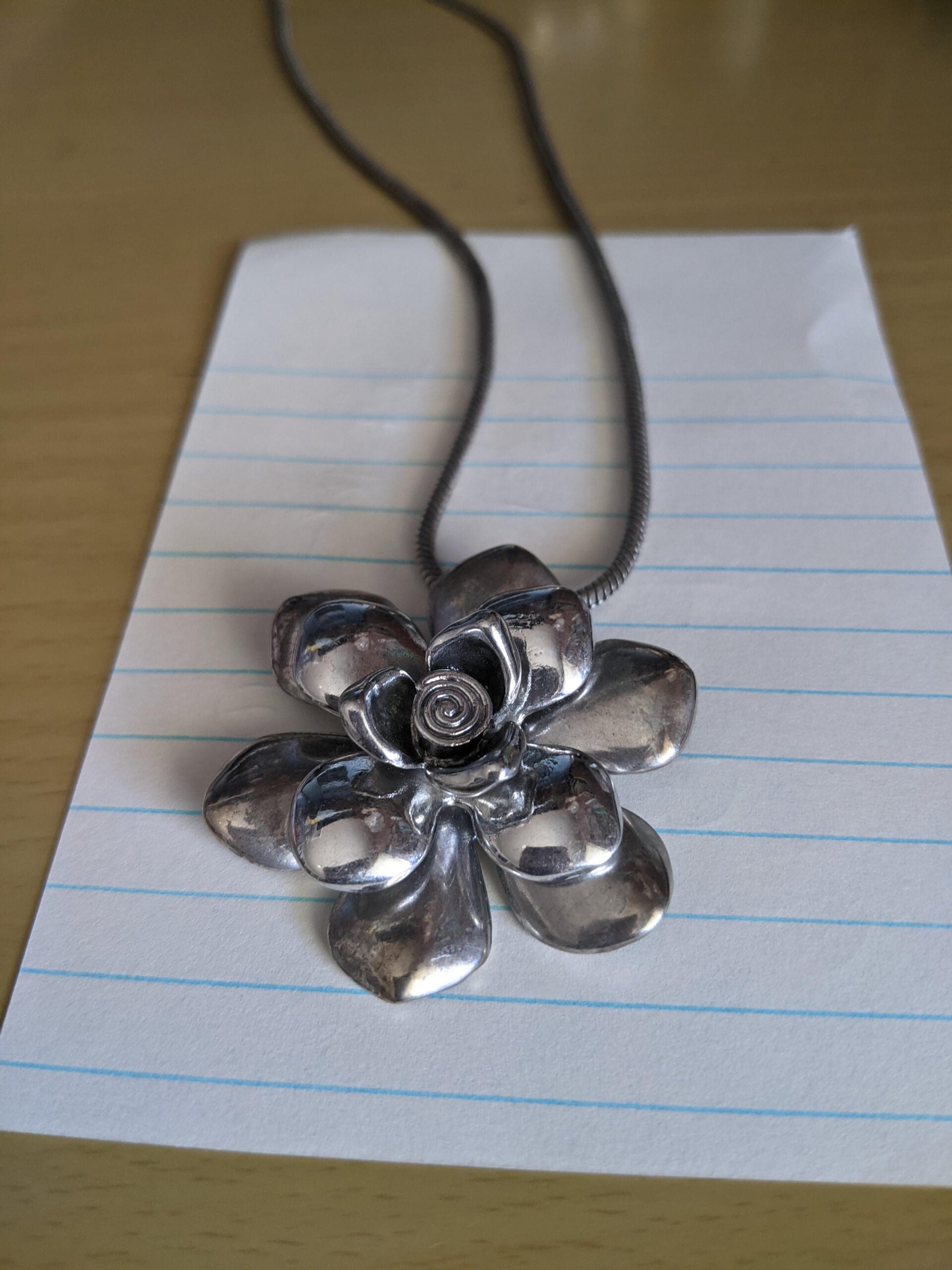 Here is an unique necklace, with thick fake silver chain and large flower on the bottom of the chain.