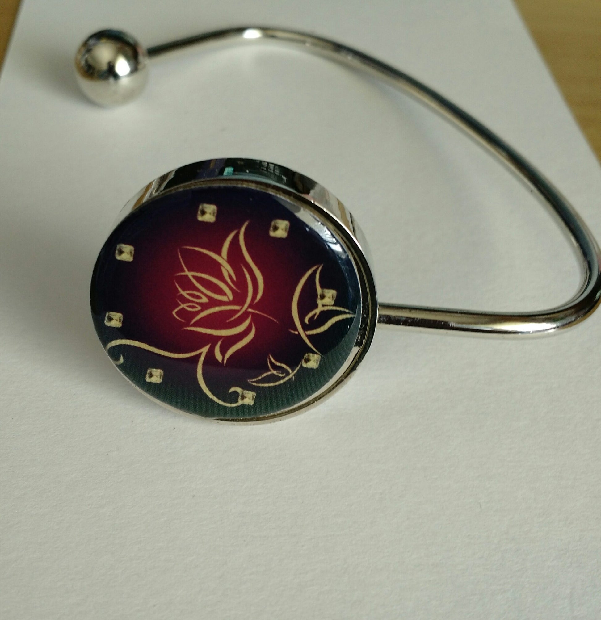 This is one is black solid background with purple and etched flower on the top of the purse hook. This one you just hang on your handles of your purse and place the purse hook on the table!