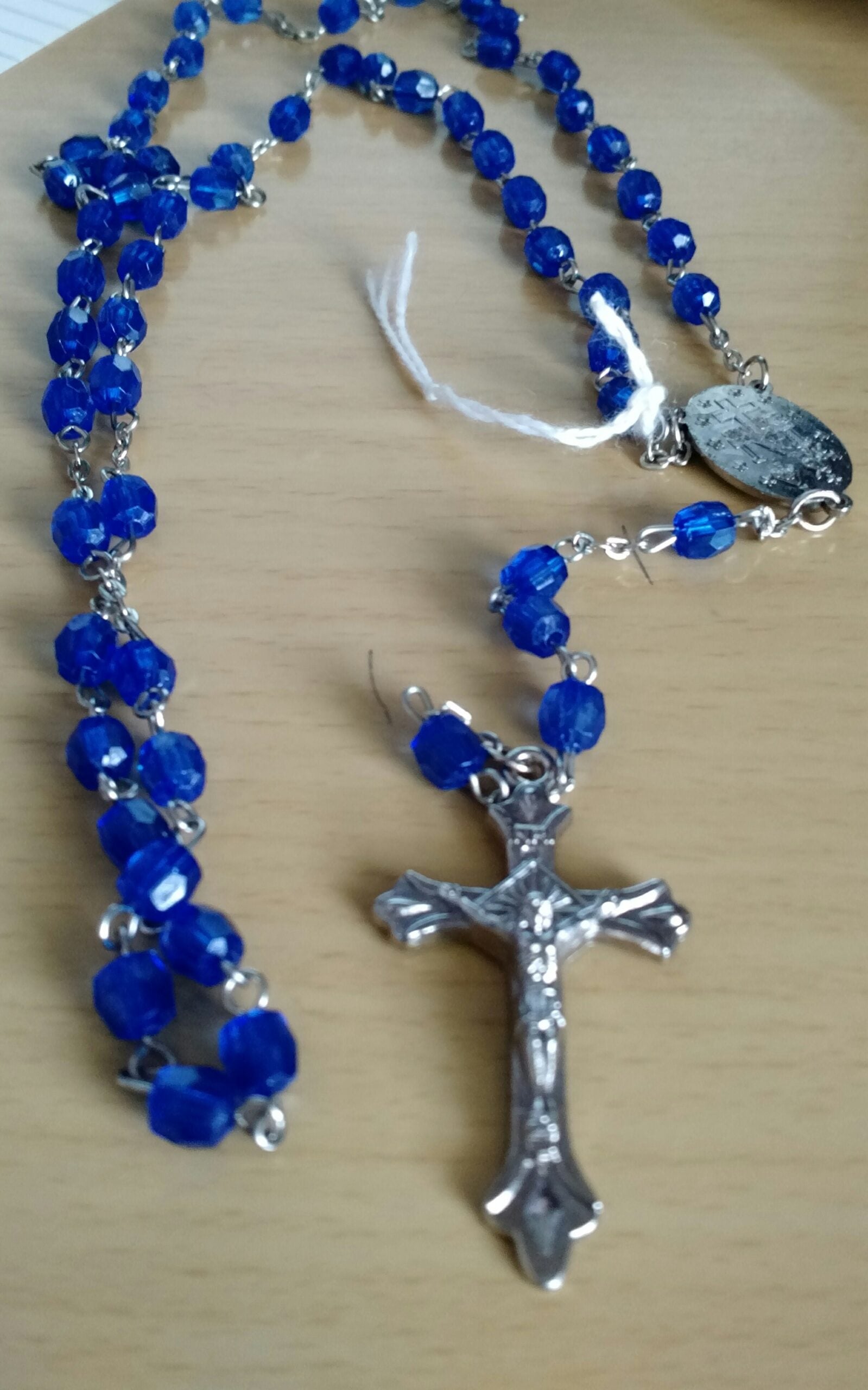 Blue beads with silver and crosses and Virgin Mother and Jesus on the cross part of the rosary.