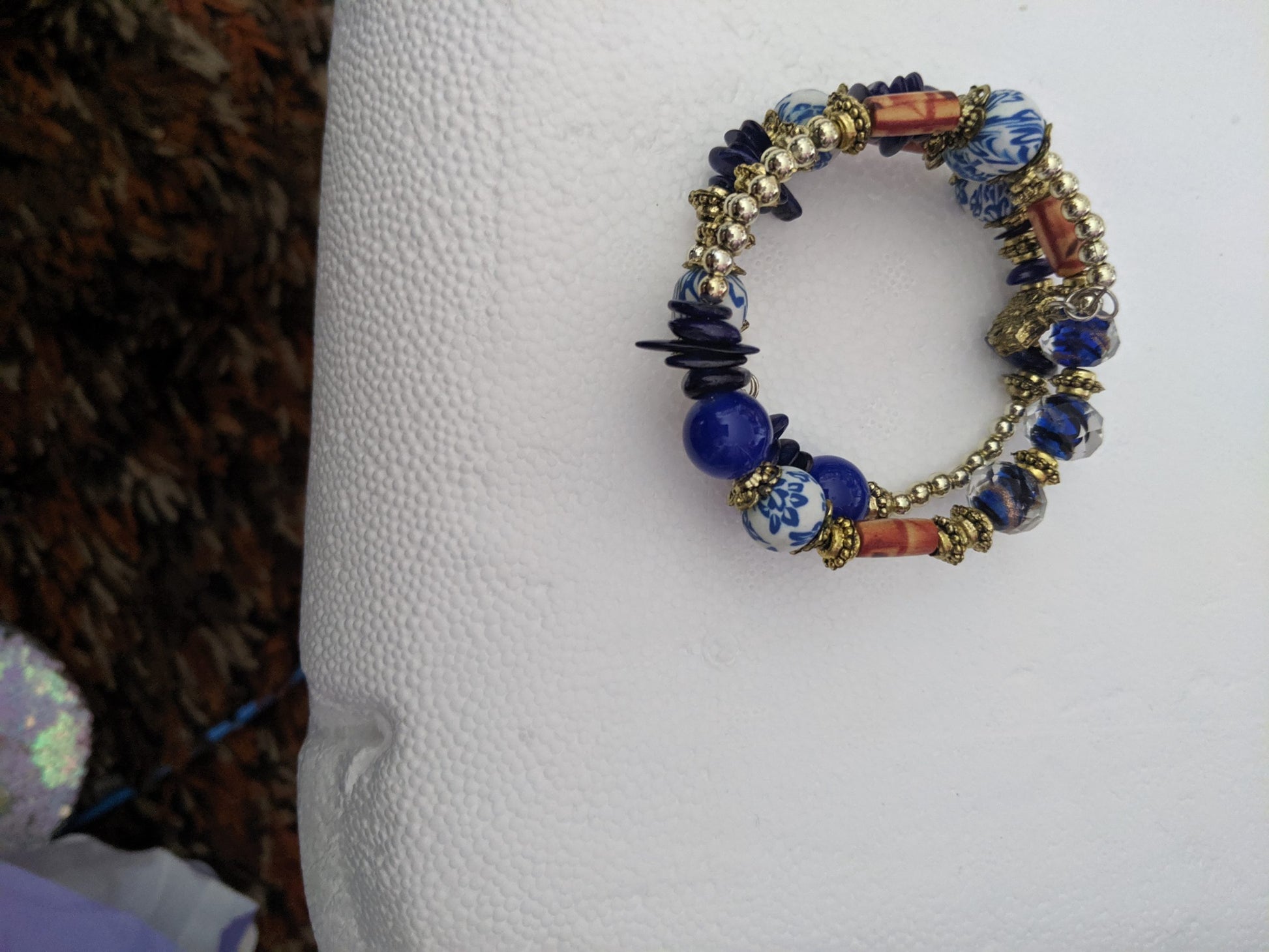 It features dark blue beads and white beads with blue and brown and gold beads too.