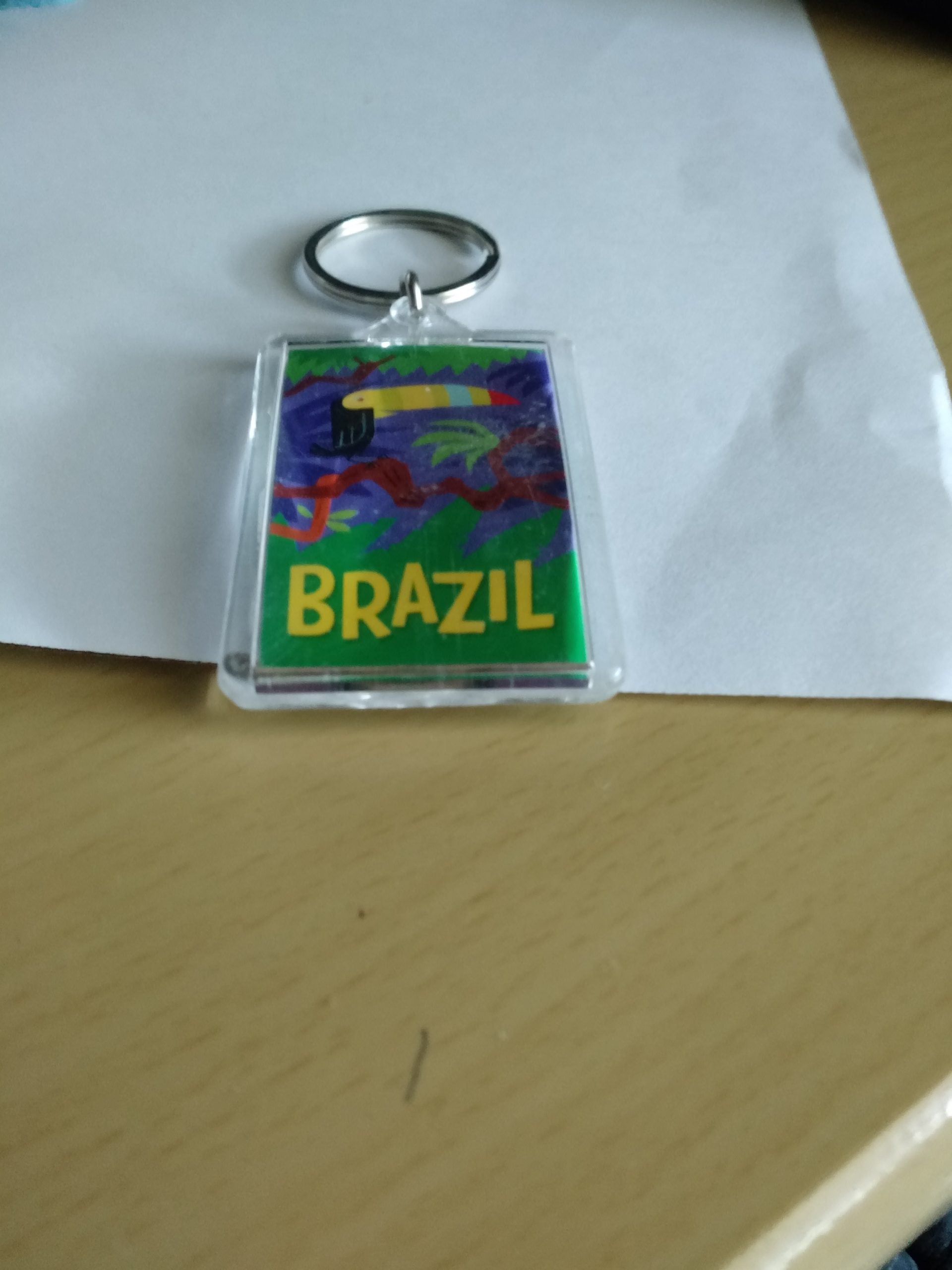 It has the long beck black bird on the front and some plants in the front of the key chain.