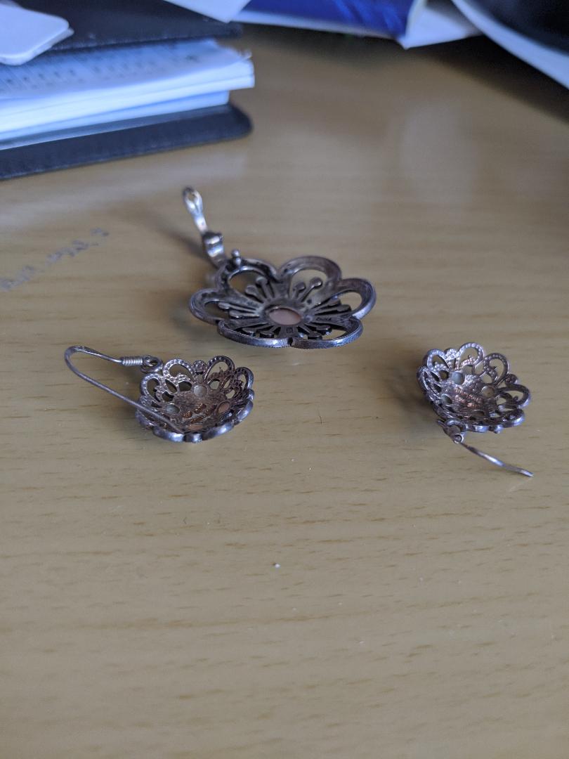 It features a large pendant with marcasite and opal stone, and matching wire earrings.