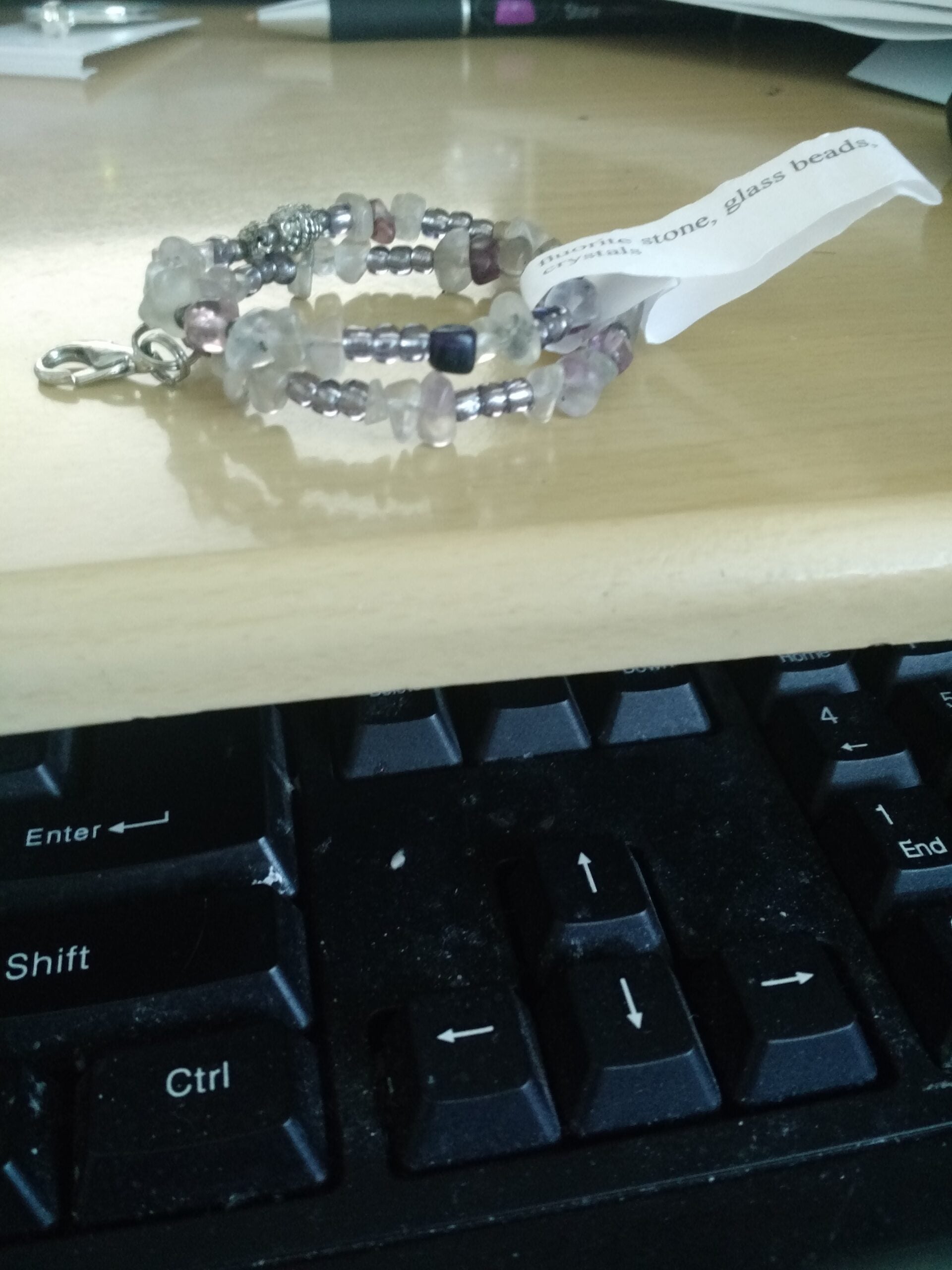 This is an unique bracelet key chain that has fluorite stone, glass beads and crystals.
