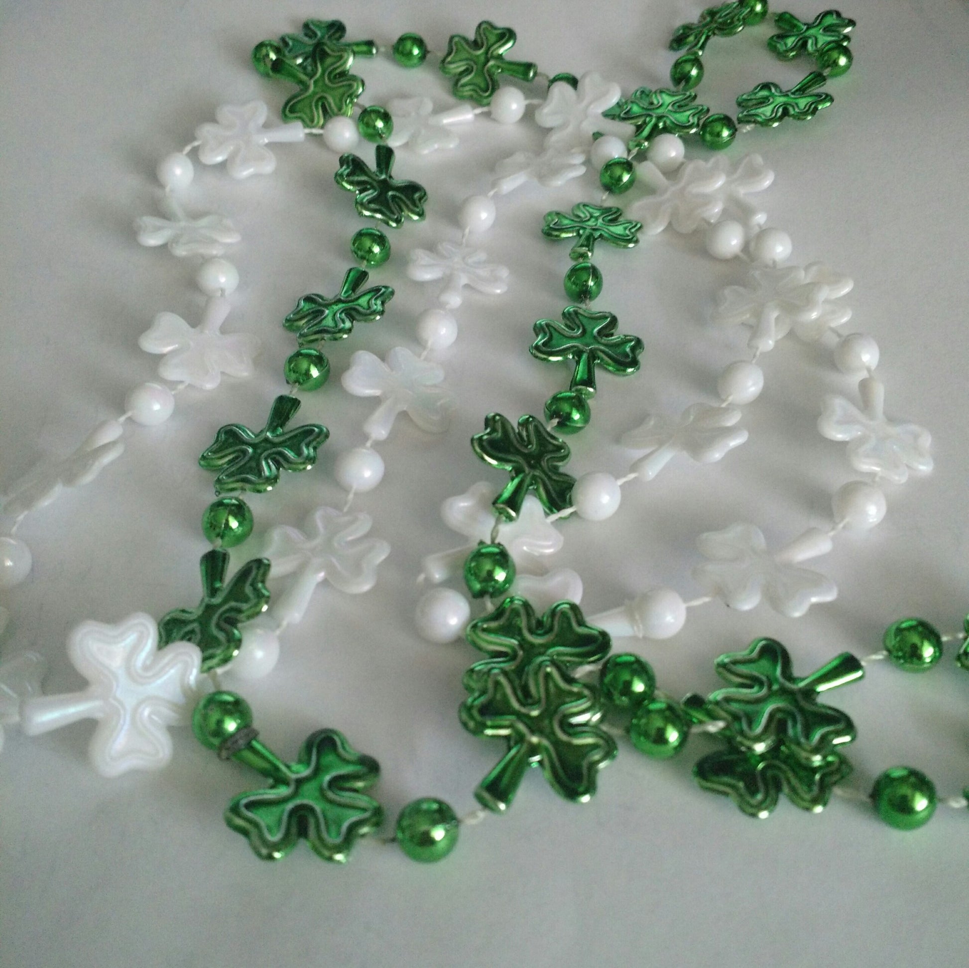 Green and White Clover plastic necklaces all ready for St. Patrick's Day!