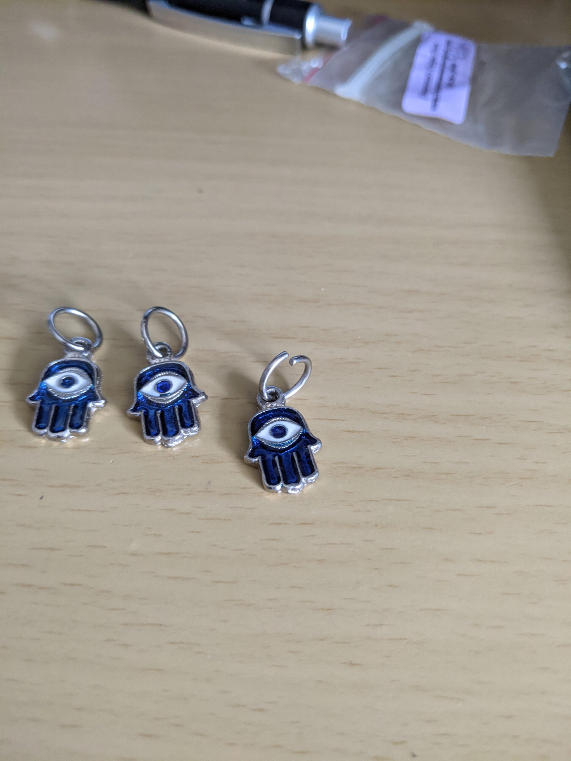 Three blue hamhest charms with thick rings and evil eye in the center of each charm.