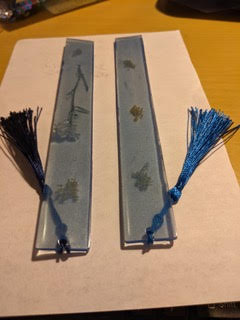 The material is resin with white baby breath inside the bookmarks and dark and light blue tassels.