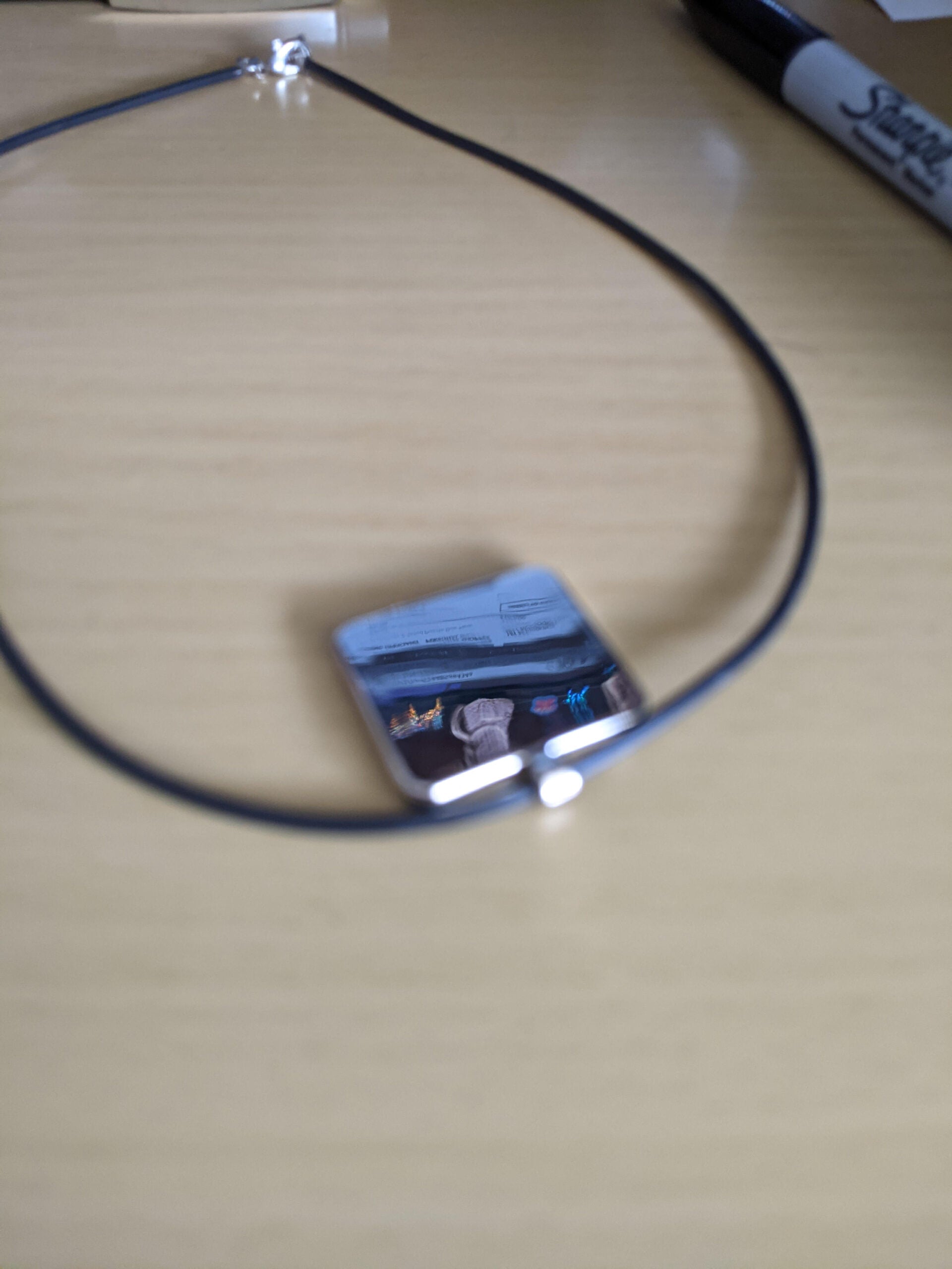 It features a silver plated white square pendant with Happy Chanukah on and driedal tops too.