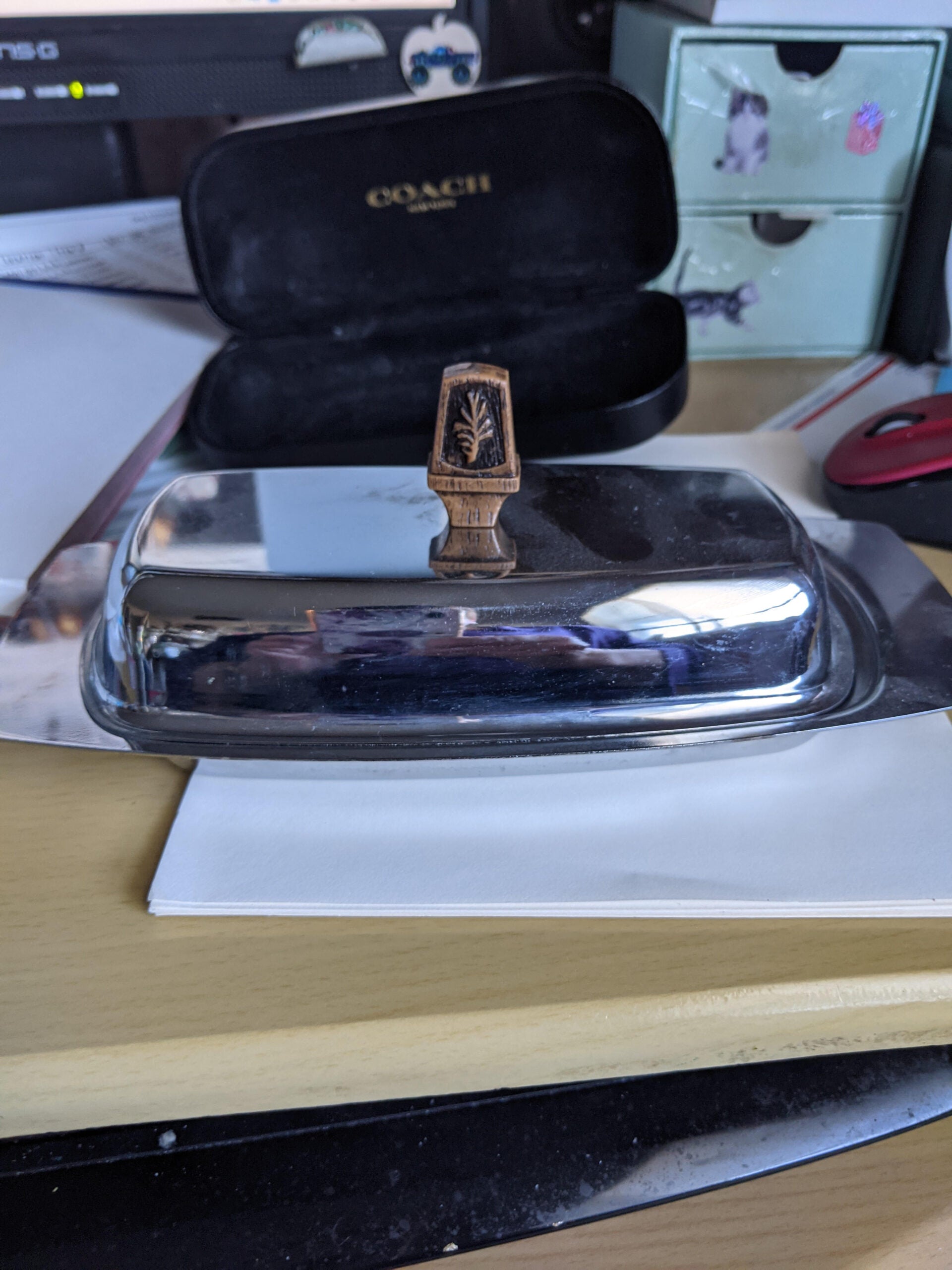 Nice butter dish silver plated with glass insert for your butter and handle.