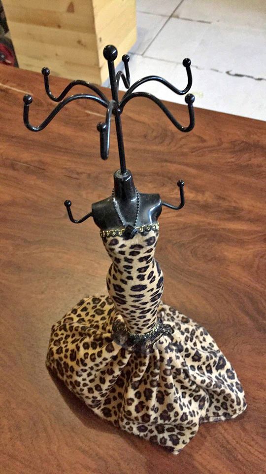 Here is a beautiful jewelry stand that is black and has animal print all over the jewelry holder.