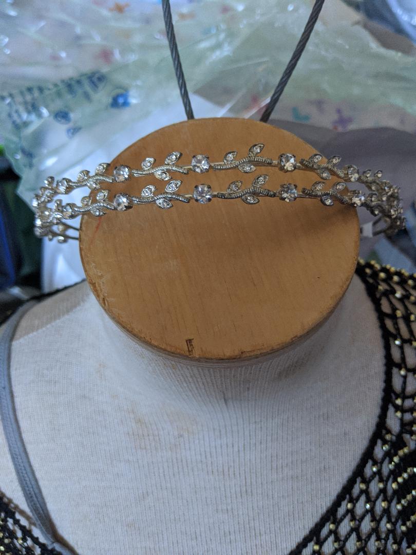 Two rows of fake rhinestones on the top of the head band and measures about 17" round.