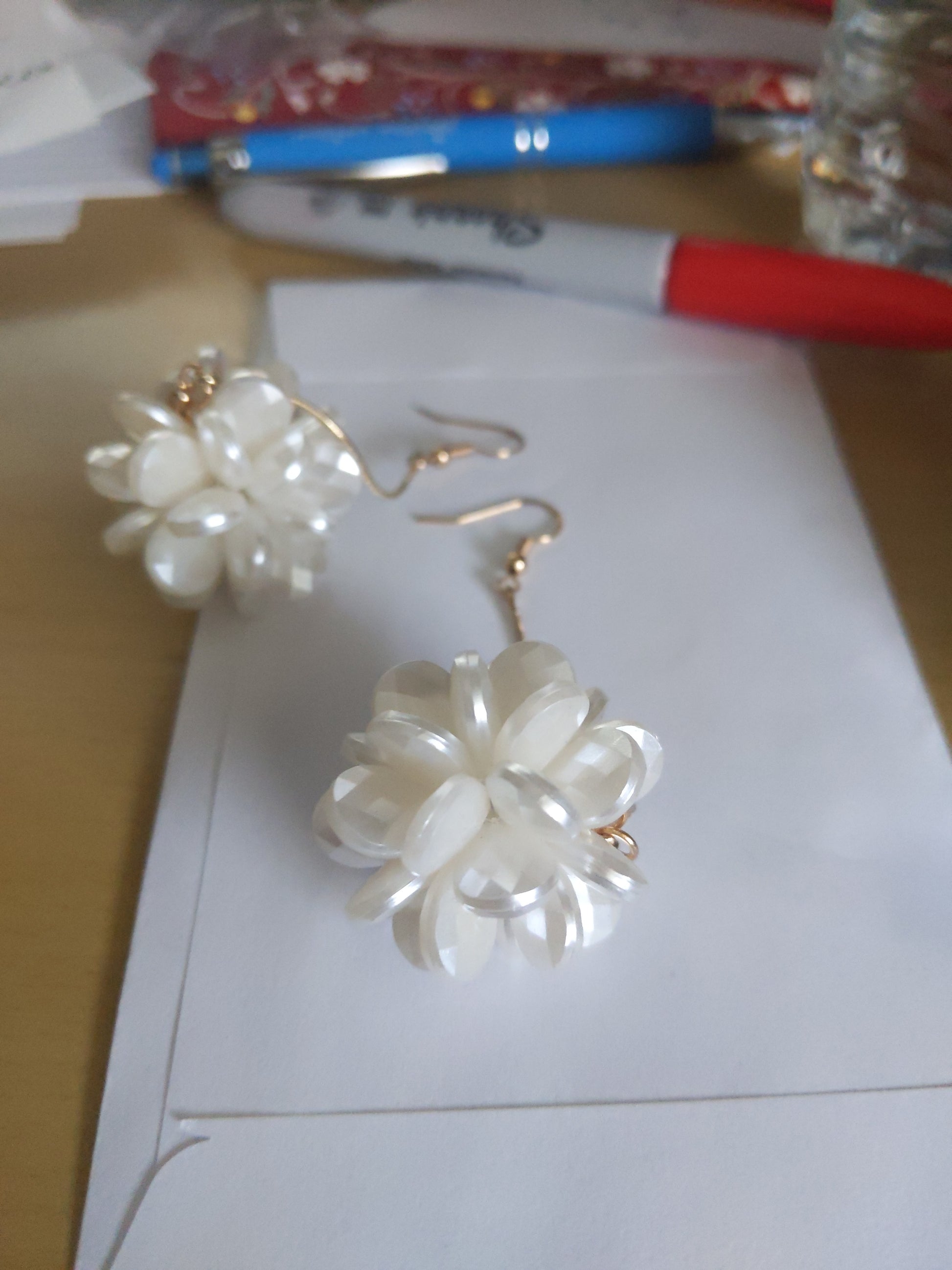 Long white flower earrings.