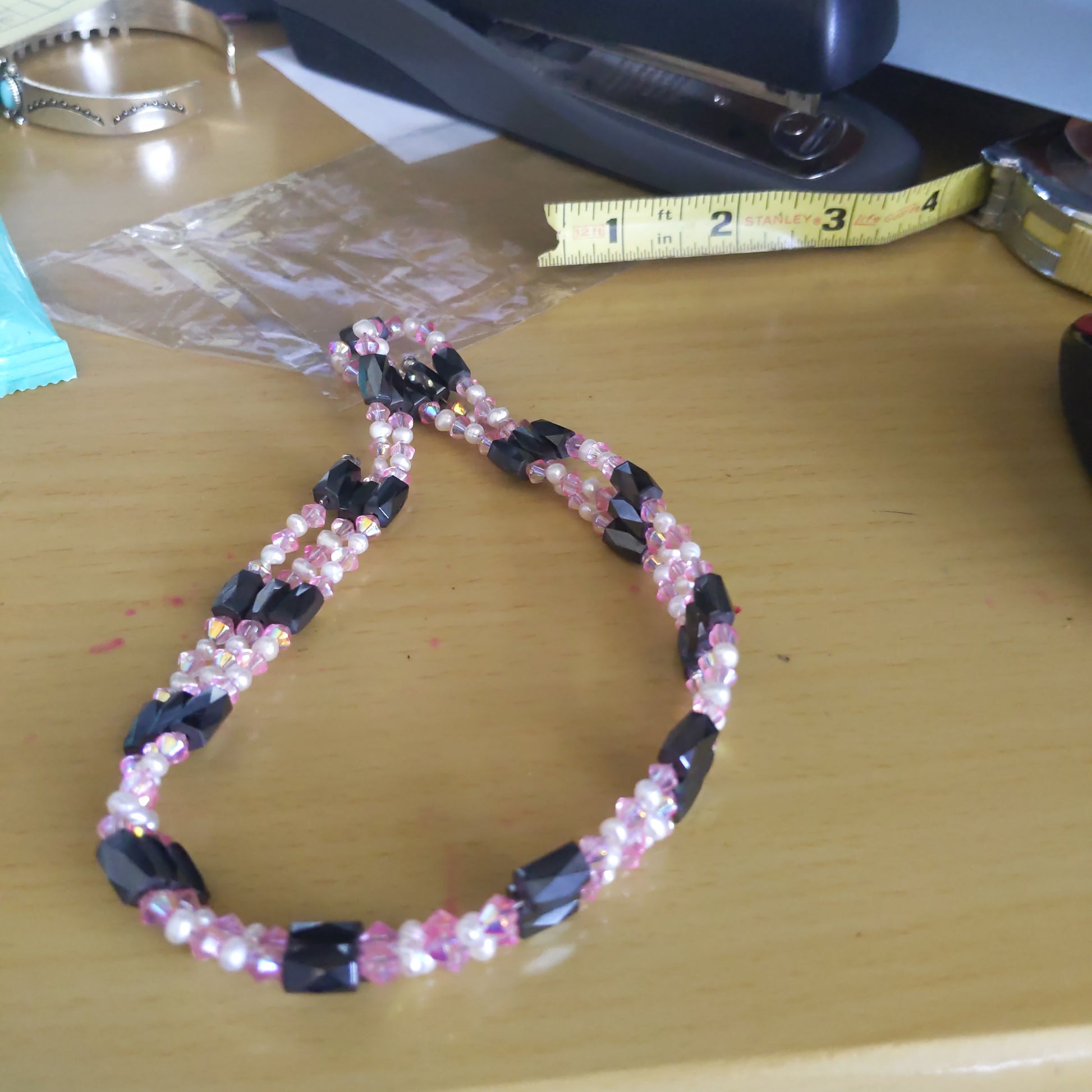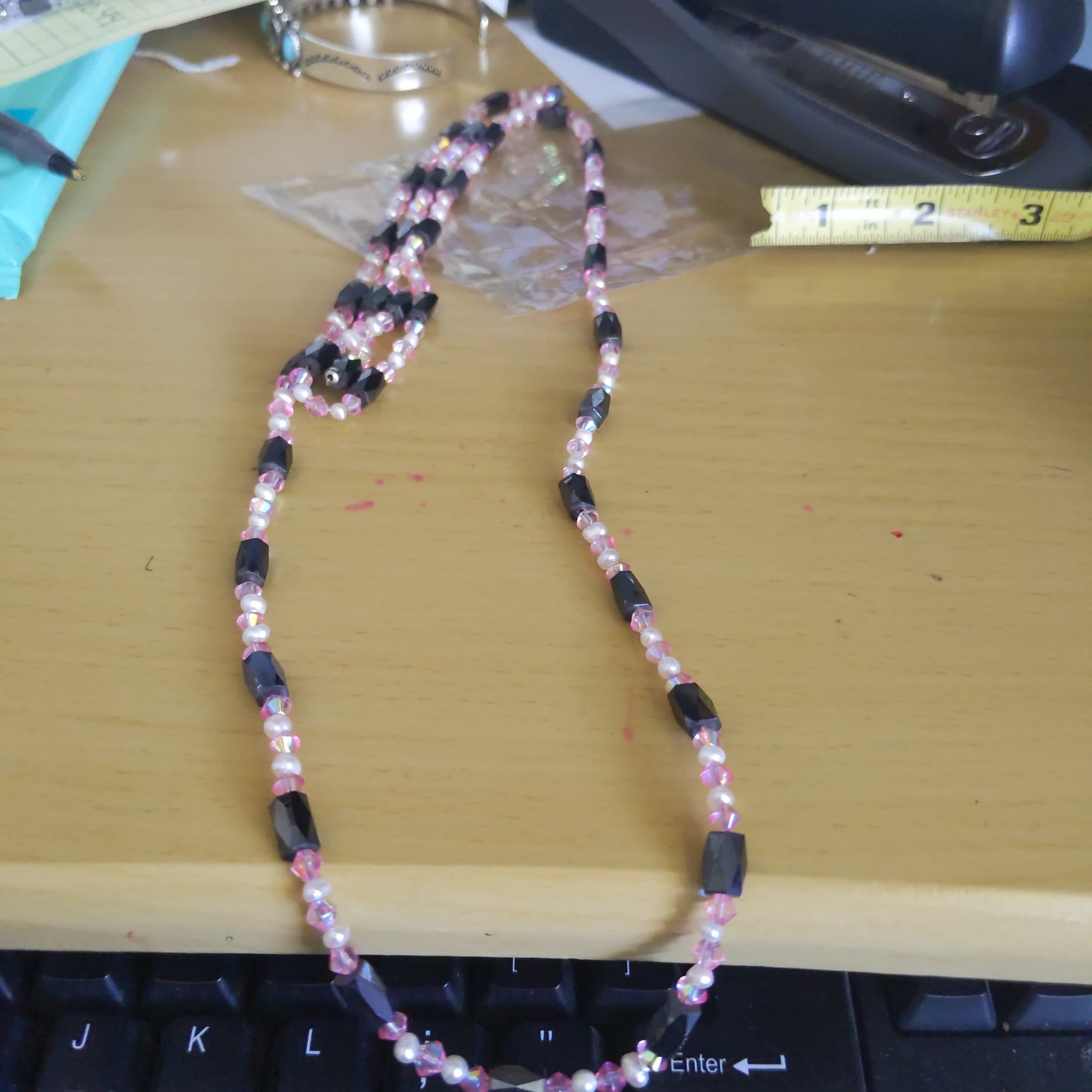 The colors are black, pink and pearl with black hemetic magnets, and the necklace measures at 34" long.