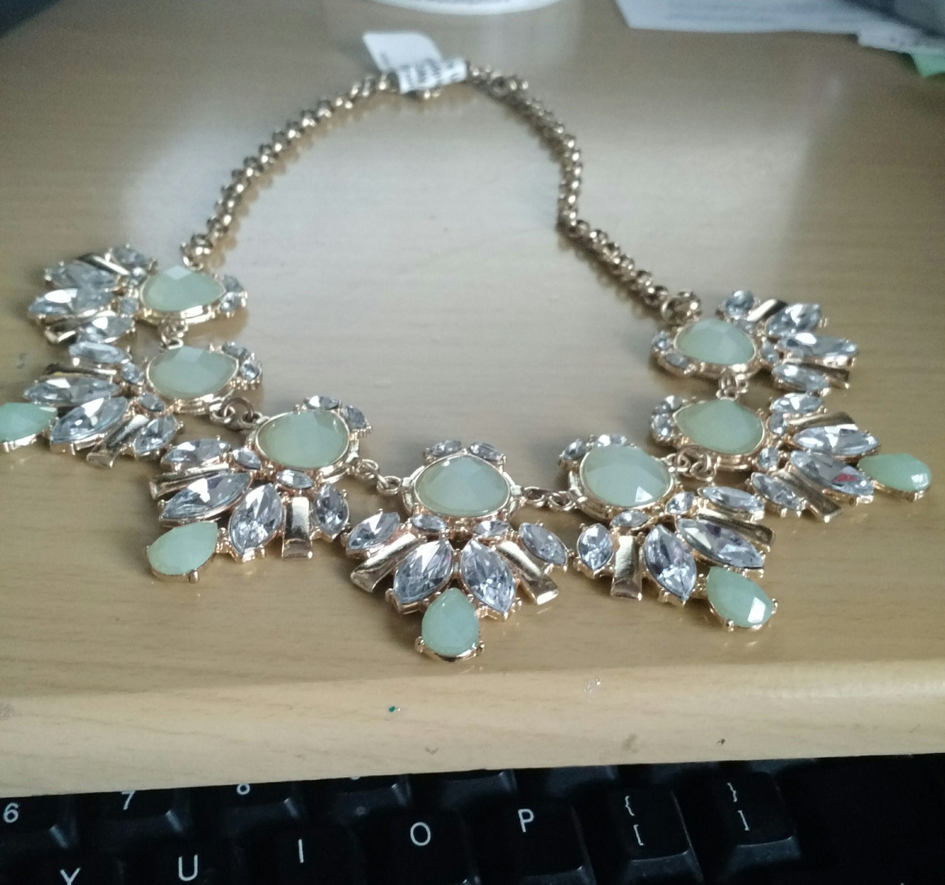 It is a statement necklace because of the heavy fake mint green and silver fake rhinestones how it lays on your neckline.