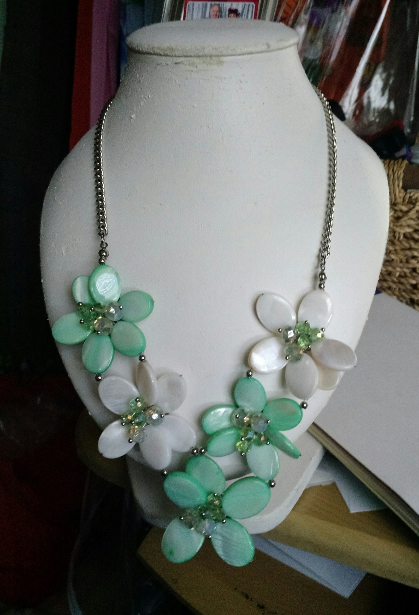 This statement necklace features medium size daisy type flowers of mint and ivory beads and then in the center of the flowers rich matching fake rhinestones of the same colors.
