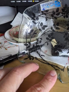 Here is an unique bowl that is glass and has black flowers all over the bowl.