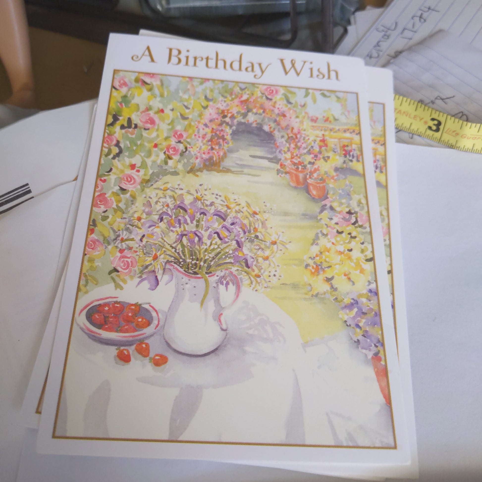 Three cards have a garden style picture with Birthday Wish and message inside.