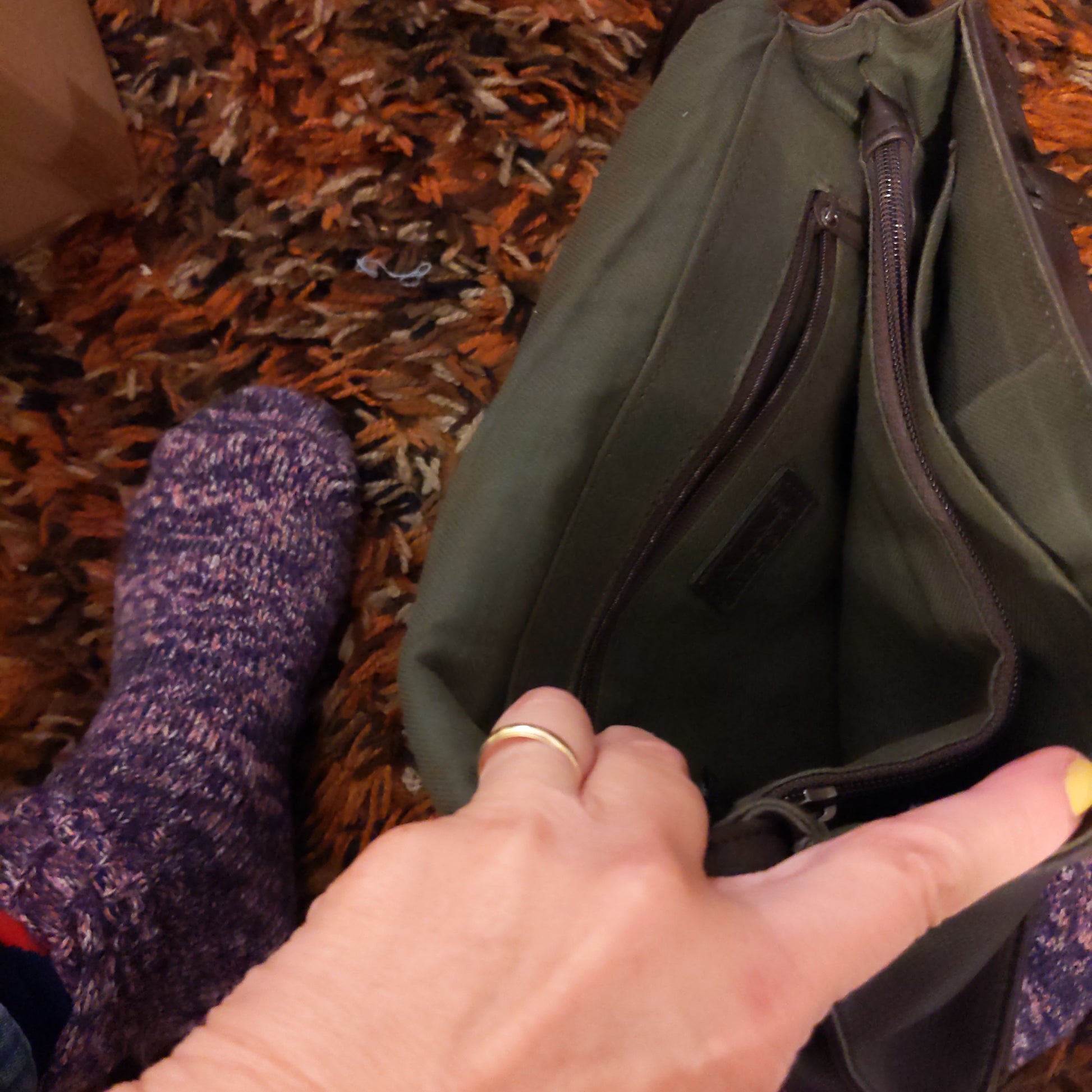 Has 3 compartments and 2 tiny zippered compartments inside the handbag.