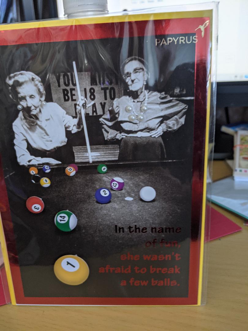 Inside the cards it saids: Here's to racking up some trouble on your birthday.