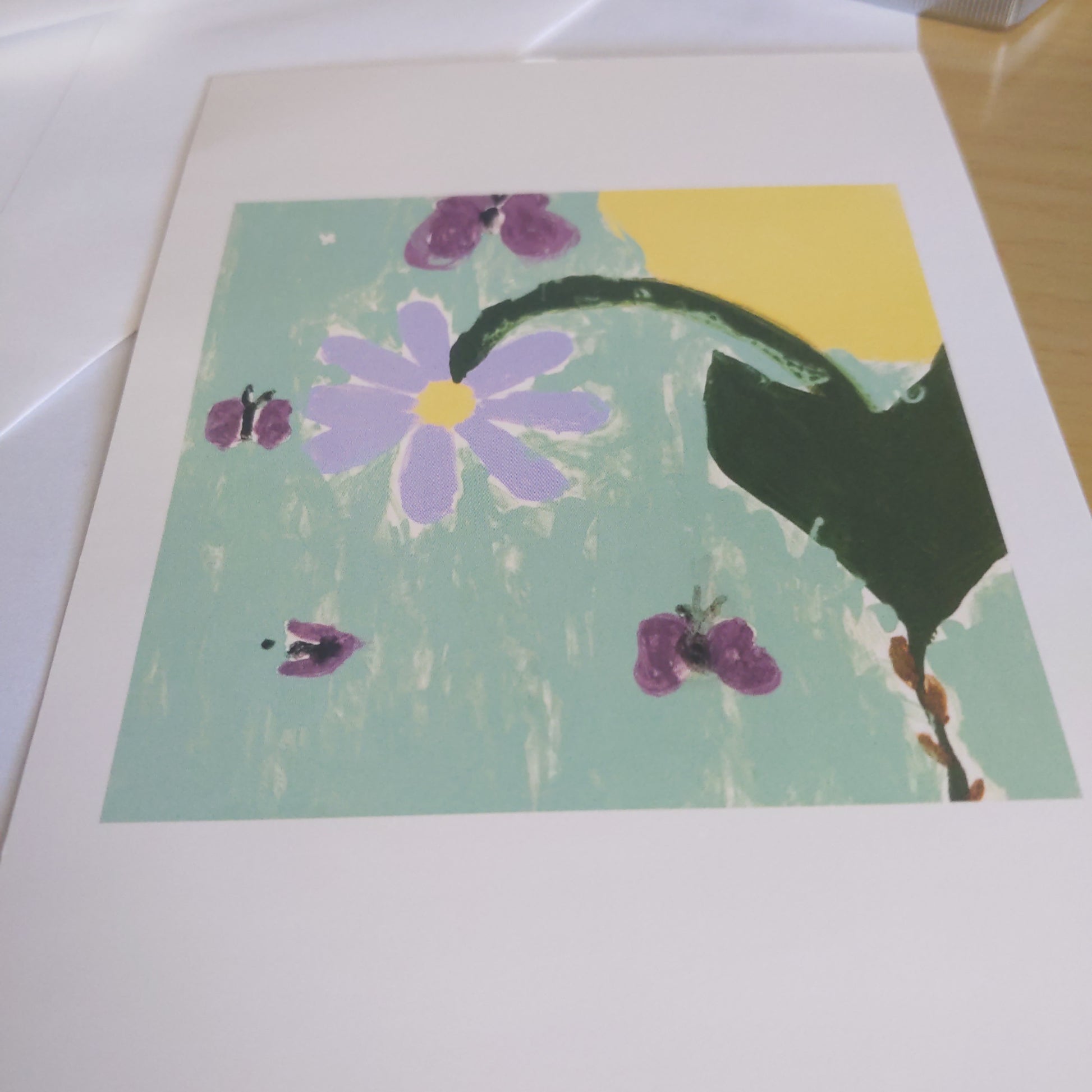 The cards measure at 5 x 7 and are mostly white with purple flower and blank inside with matching envelopes.