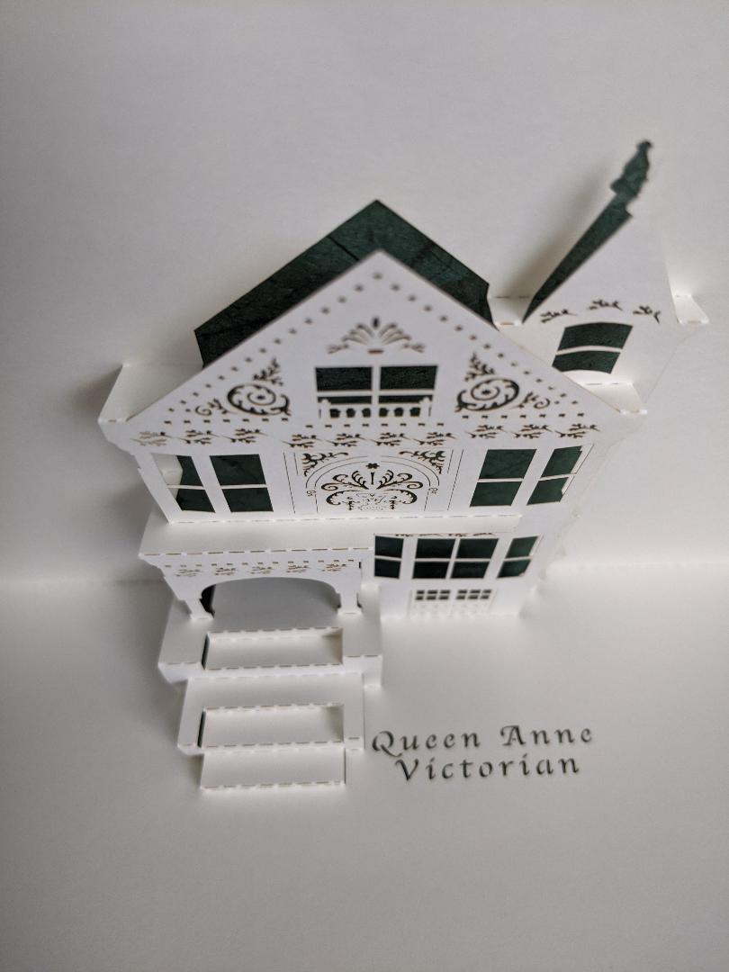 The card is green paper on the front and inside it opens to the model Queen Anne style house from the 1895 in Haight Ashbury area in San Francisco, California.