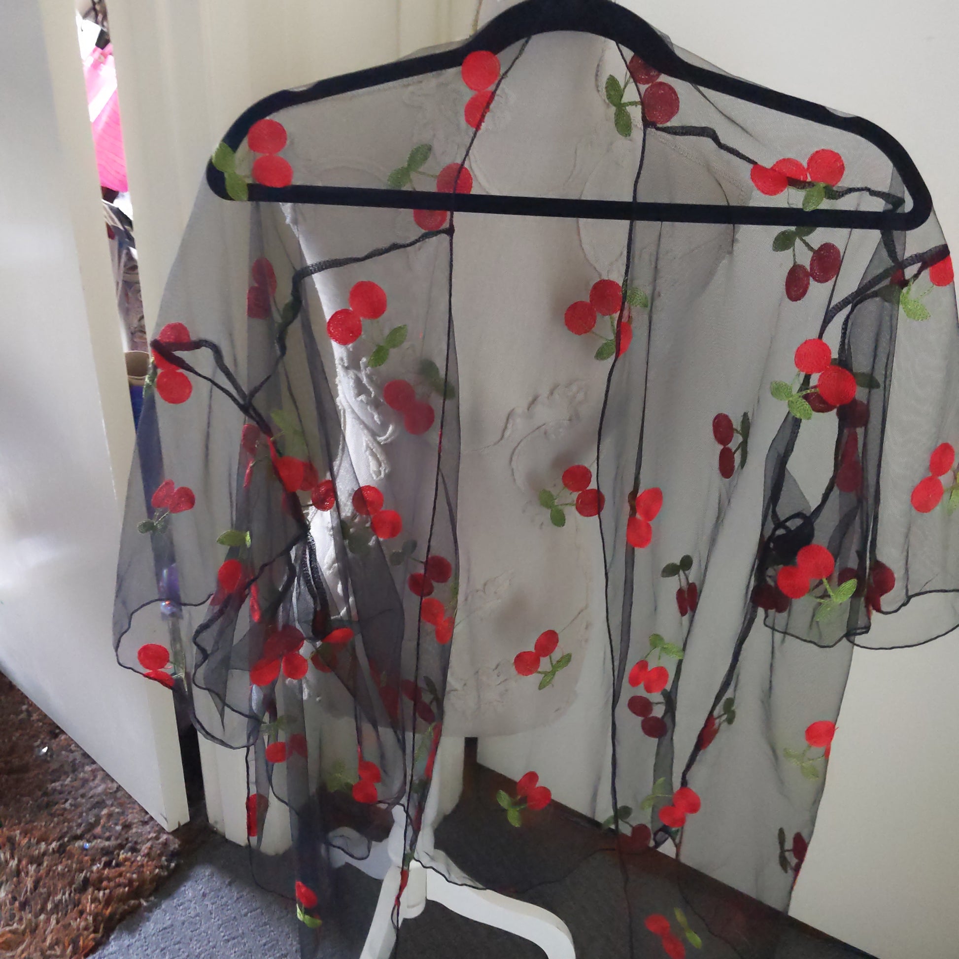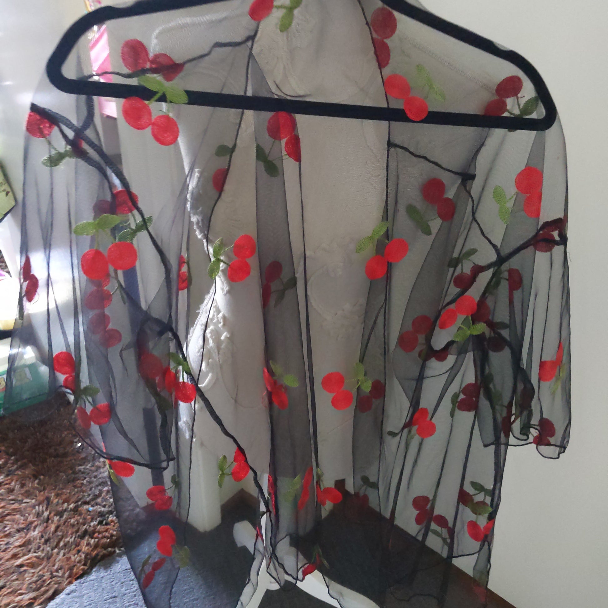 Sheer Black with Red Cherries Sleeved CoverUp for Plus Women