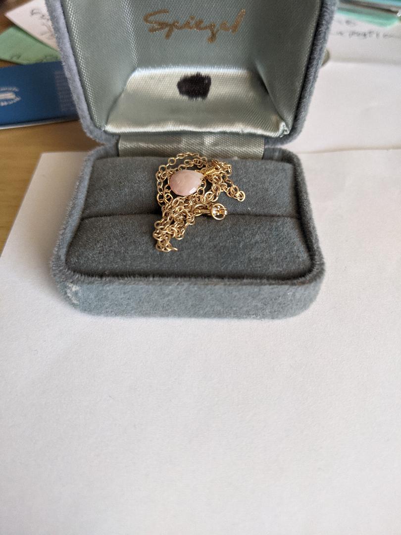 It is on fake gold chain and fake tiny pink opal, but very pretty.