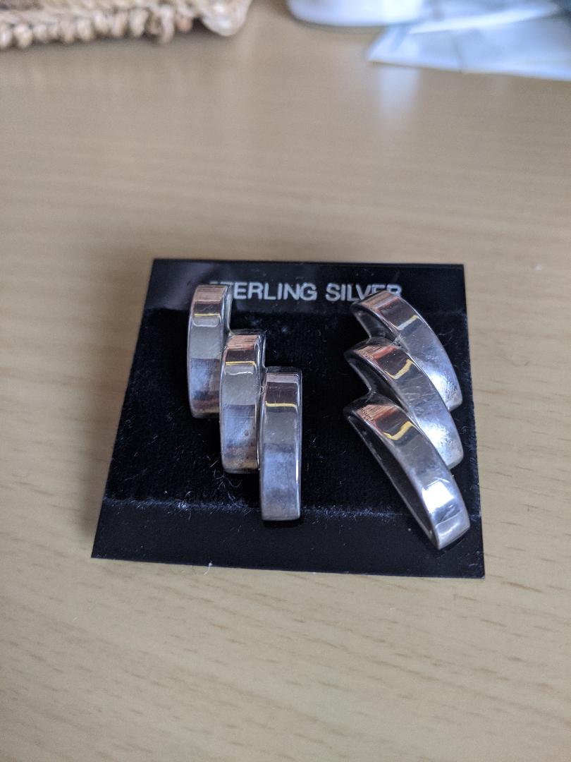 The earrings are post type earrings and are silver in color and are sterling silver.