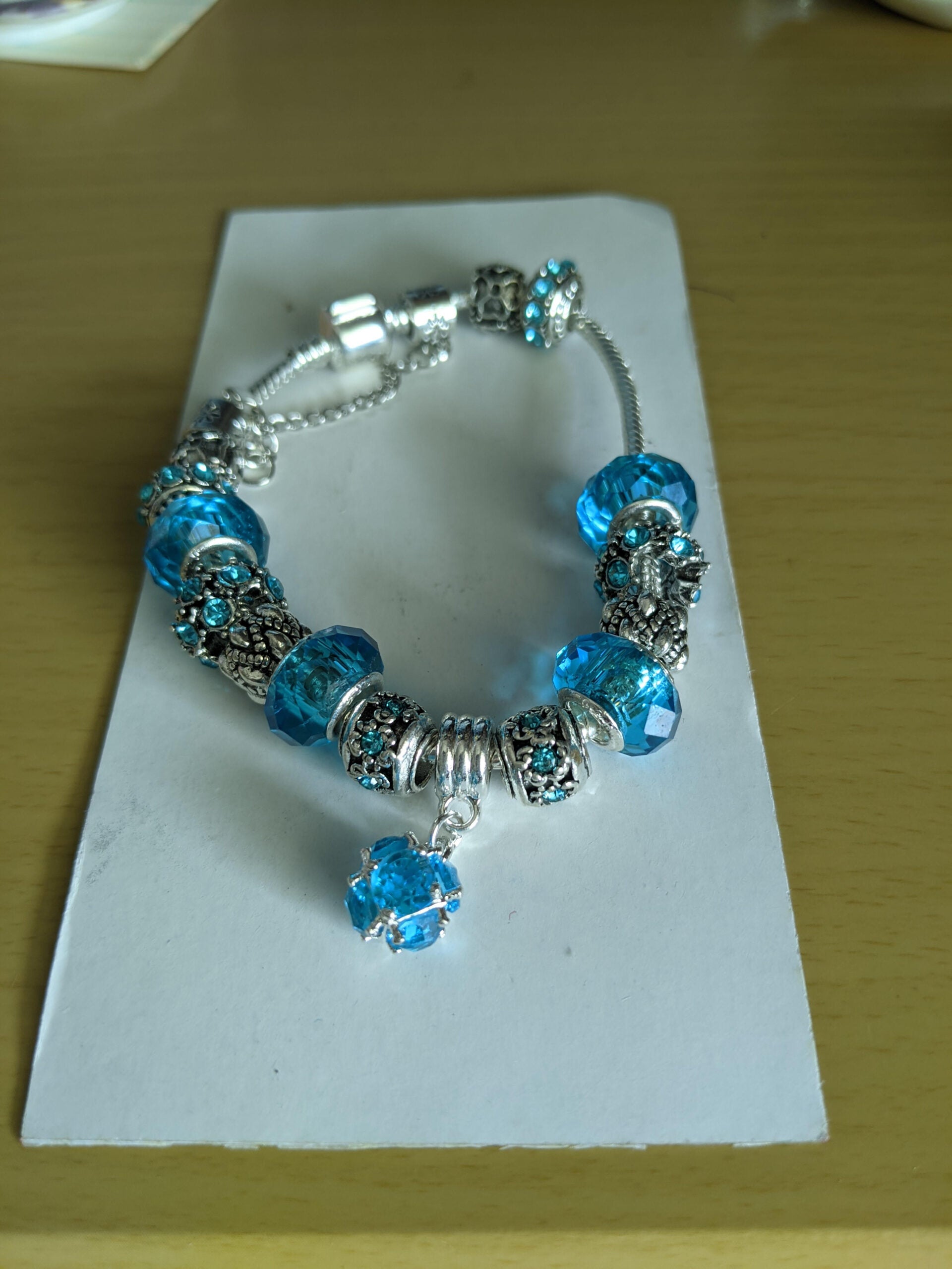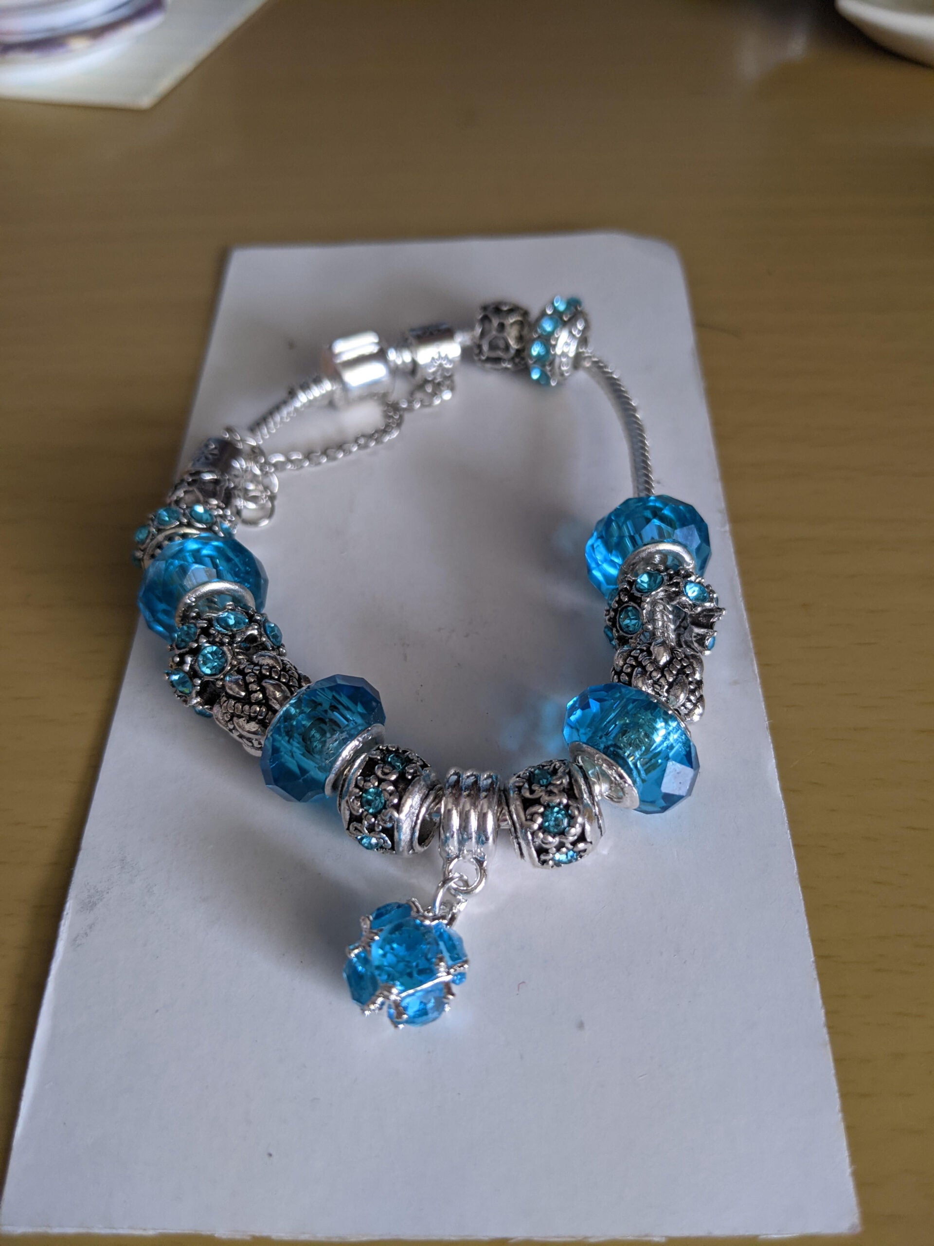 The turquoise part of the bracelet is fake Austrian Crystals and fancy silver chains and mixture of turquoise and silver together of two the colors.