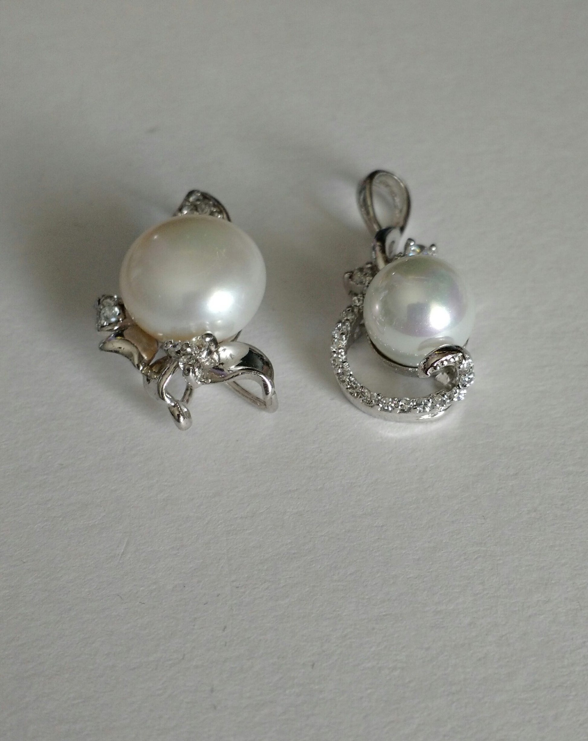 One is a small white pearl with tiny swirl of rhinestones and the other one is large white pearl with tiny drop of silver rhinestones on the pendant.