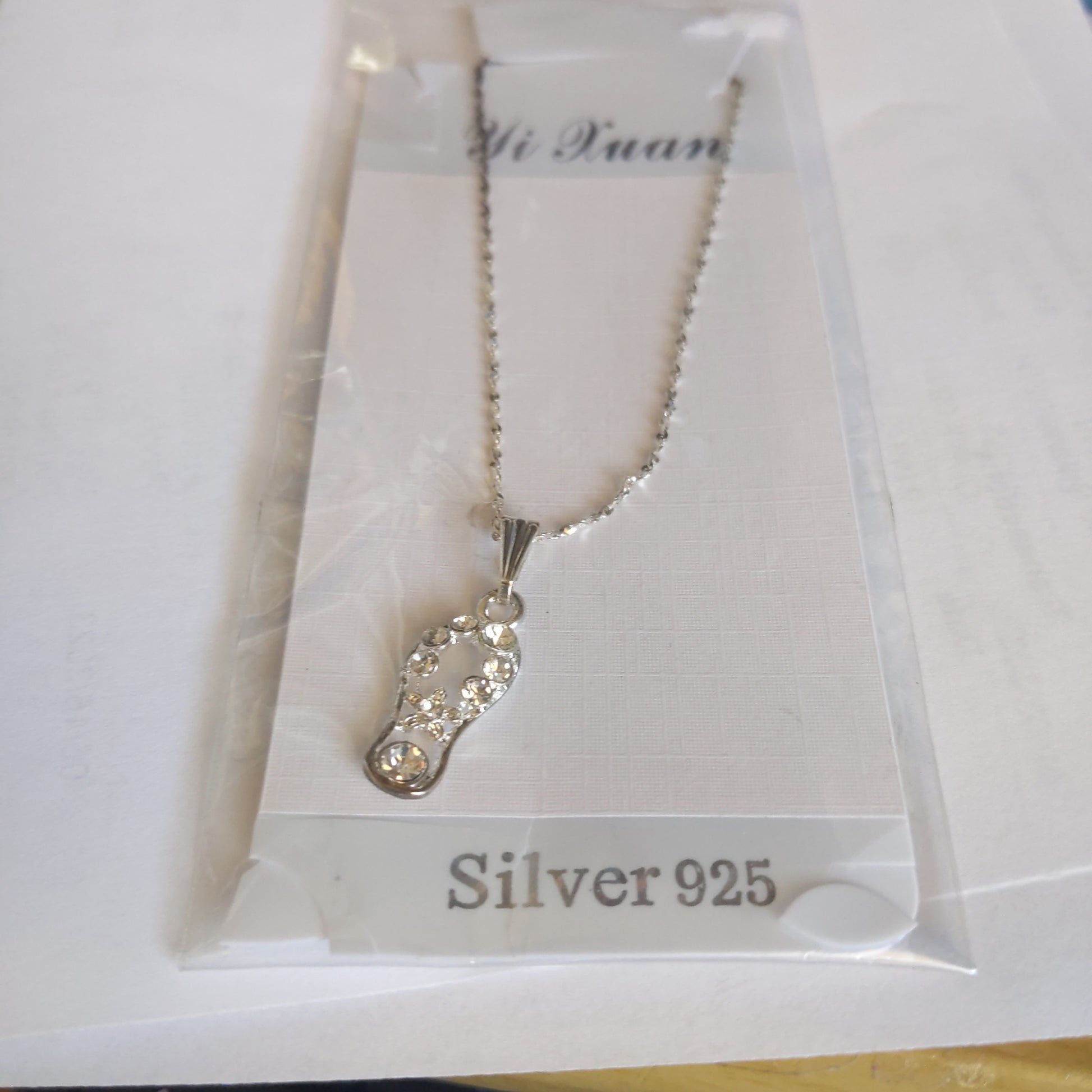 Has silver 925 which means sterling silver and has silver rhinestones on flip flops pendant.