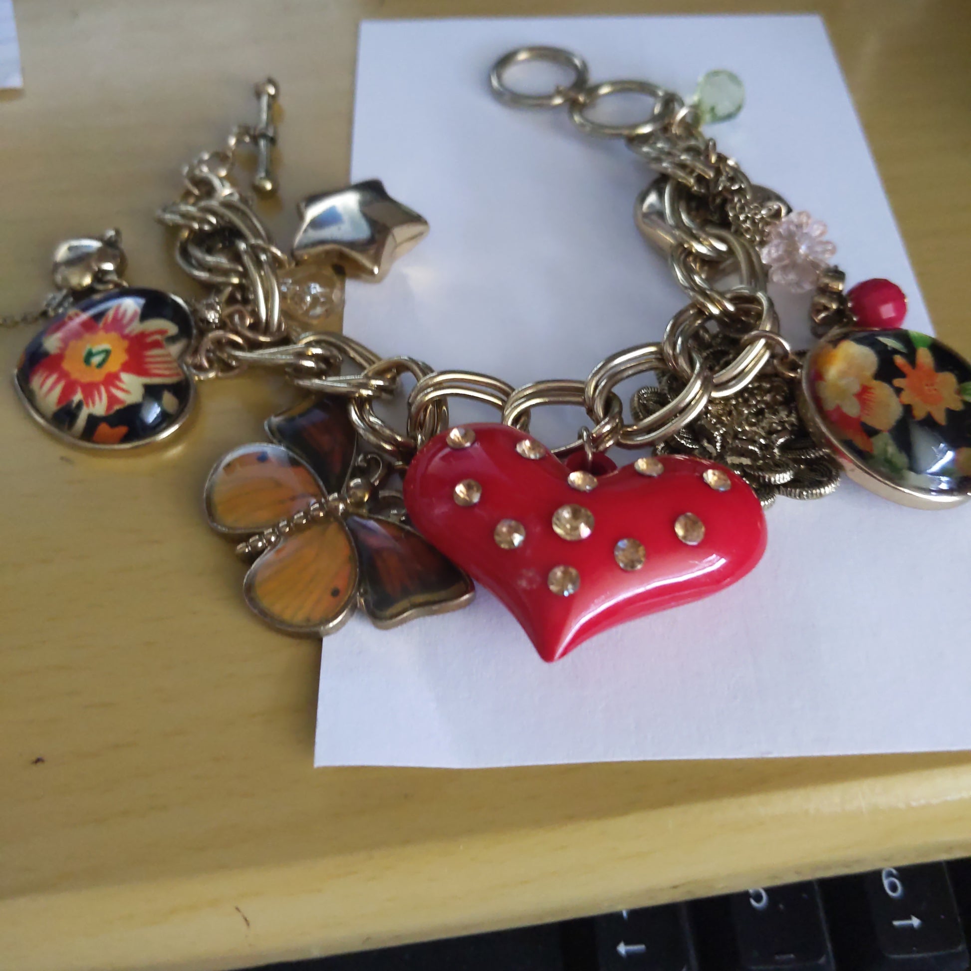 It is very unique has big puffy red heart with fake gold rhinestones, a face heart, a star, three medium flower charms, a brown and beige butterfly and on thick chain to accent the bracelet.
